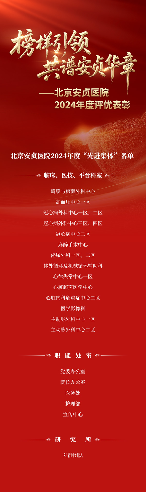 2024年是北京安贞医院建院40周年,更是通州院区启用、实现两院区一体化发展的落地之年。在新时代安贞精神的指引下,安贞人凝心聚力,努力打造心血管疾病救治的最后一站,建设中国最好的医院。每一个忙碌的身影,每一次专注的诊疗,每一场执着的坚守,都承载着安贞人坚定的信念与力量。经过前期组织评选,院长办公会、党委会审议通过,最终评出2024年度“优秀员工”468人、“优秀管理干部”48人、“先进集体”20个、“专项奖”3个。此刻,让我们将镜头聚焦这些默默奉献安贞人,共同见证属于他们的荣耀时刻。